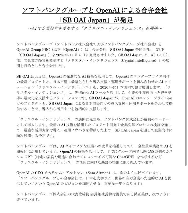 According to official information disclosed on SoftBank Group’s website, a groundbreaking development has taken place in the tech industry. On November 5, SoftBank Group and OpenAI jointly announced the formal establishment of a strategic joint venture named SB OAI Japan GK. This move marks a significant milestone in the collaboration between two tech titans, signaling their shared ambition to drive innovation and transform the business landscape in Japan and beyond.