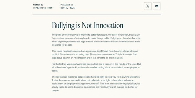 In reaction to Amazon’s notice to cease operations, Perplexity swiftly released an open letter titled “Bullying Does Not Equal Innovation.”